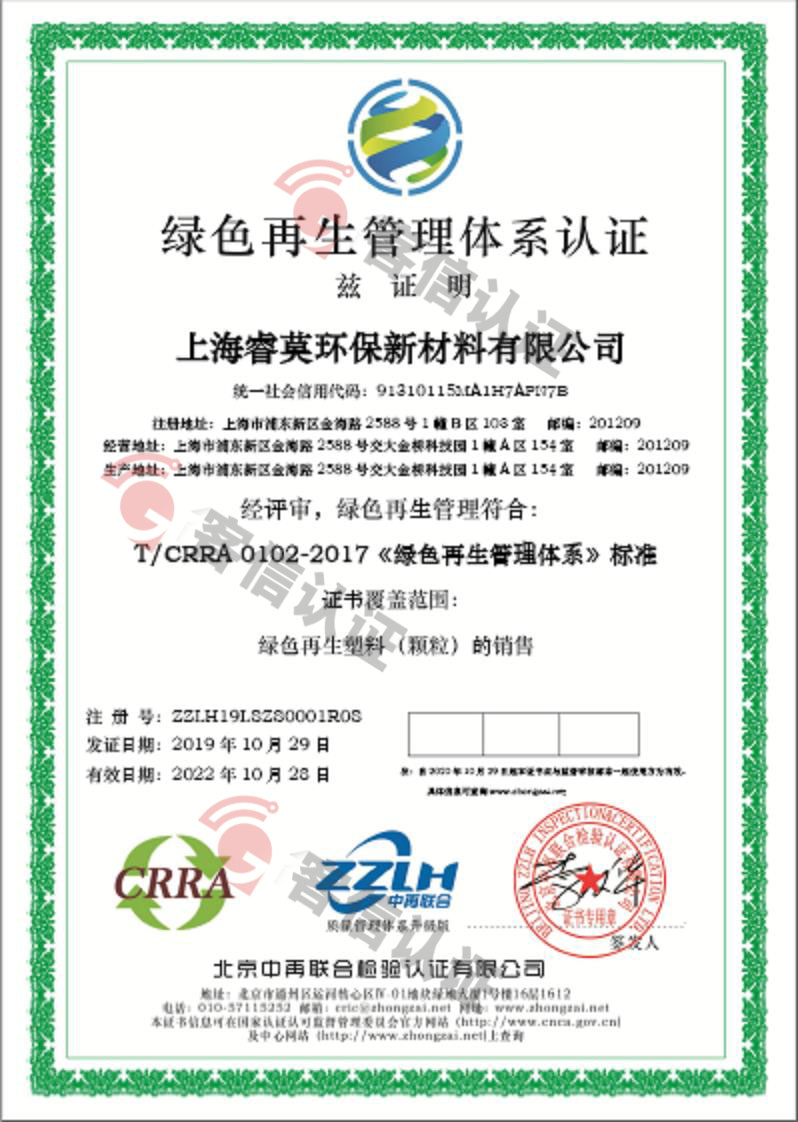 恭喜上海睿英環(huán)保新材料有限公司獲得綠色再生管理體系認(rèn)證