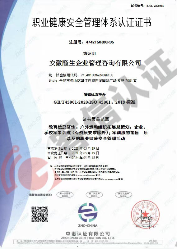 恭喜安徽隆生企業(yè)管理咨詢有限公司獲取ISO三體系認證證書
