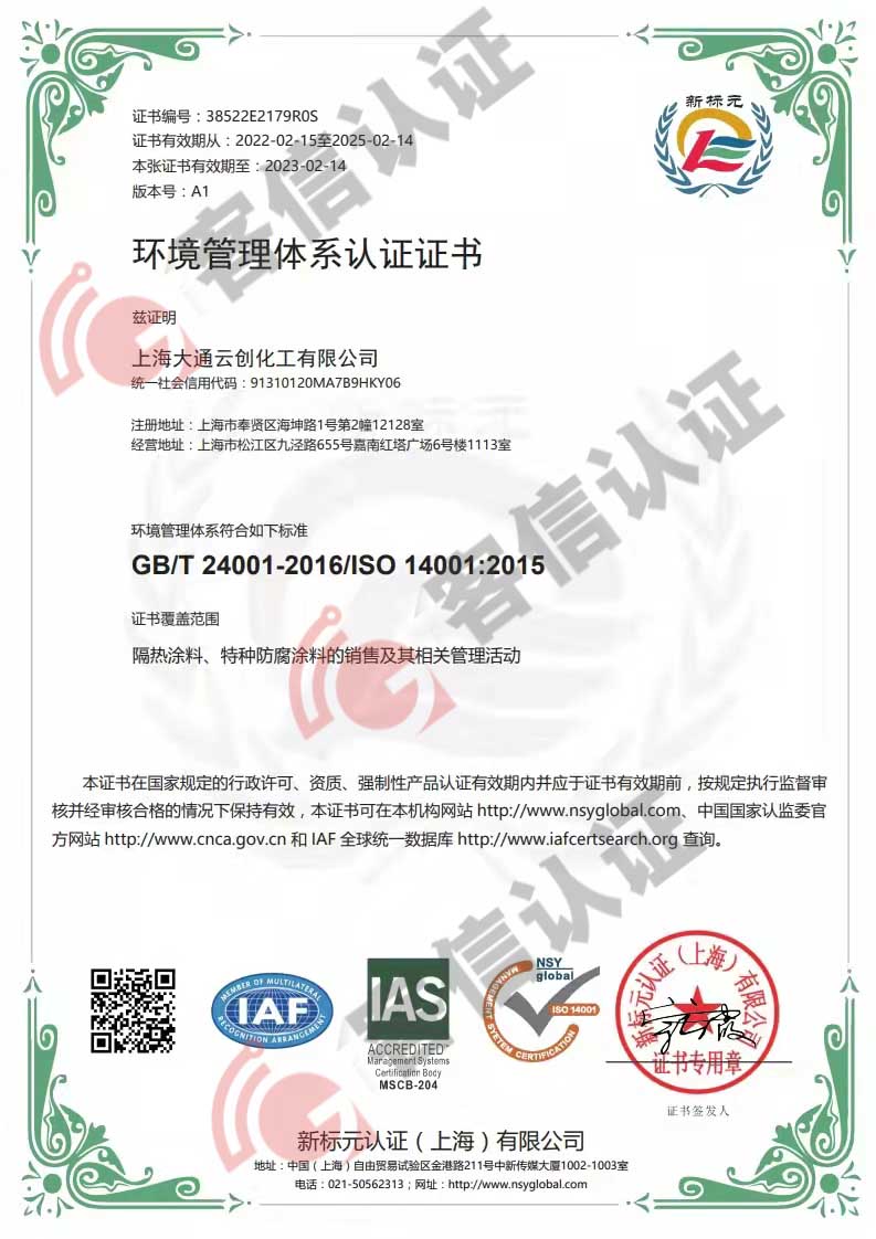 > 恭喜上海大通云創化工有限公司獲得ISO三體系證書