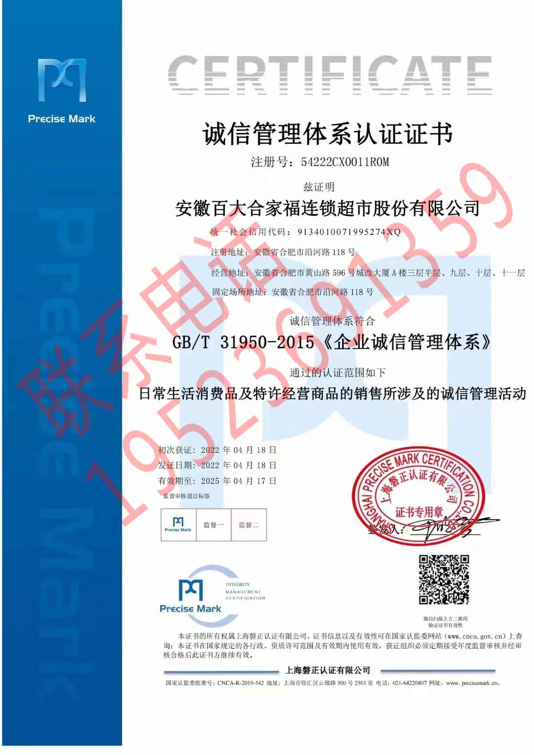 恭喜安徽百大合家福連鎖超市股份有限公司獲得服務認證證書