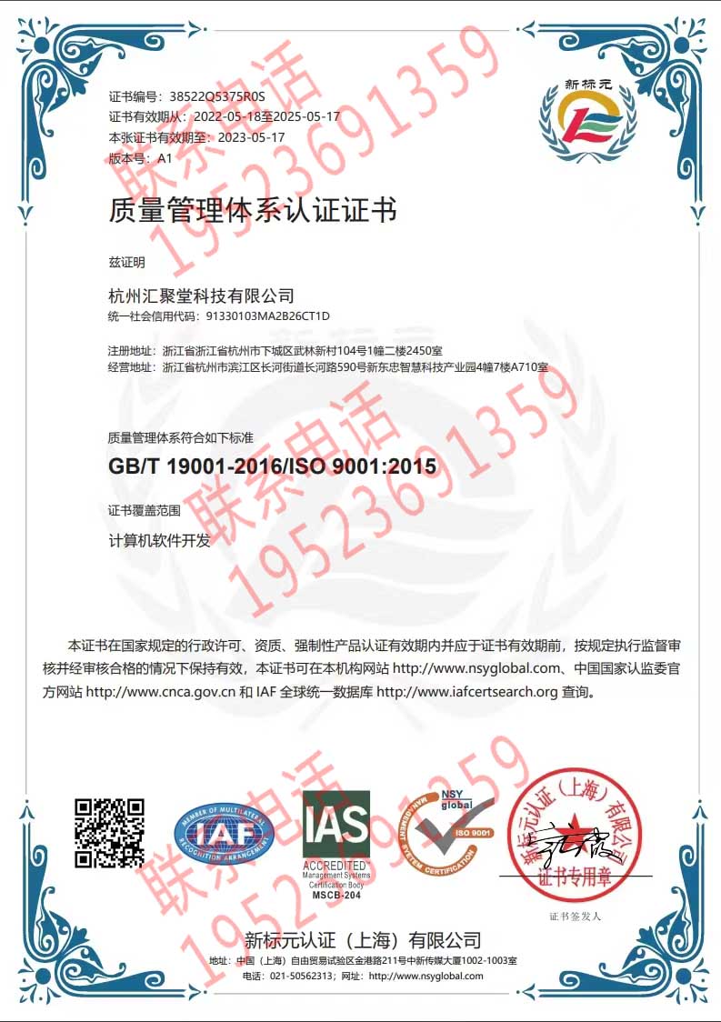 恭喜杭州匯聚堂科技有限公司獲得ISO三體系認證證書